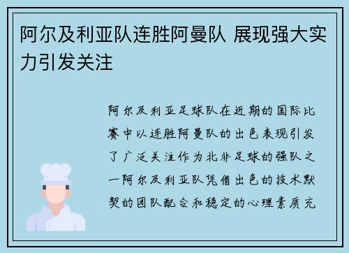 阿尔及利亚队连胜阿曼队 展现强大实力引发关注