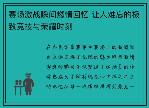 赛场激战瞬间燃情回忆 让人难忘的极致竞技与荣耀时刻