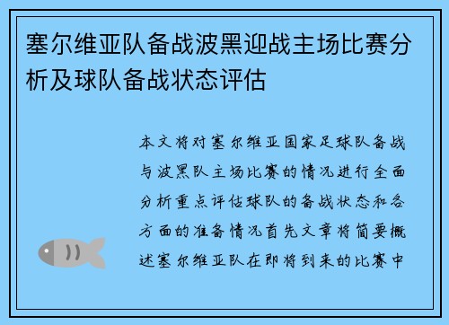 本文将对塞尔维亚国家足球队备战与波黑队主场比赛的情况进行全面分析,重点评估球队的备战状态和各方面的准备情况。首先,文章将简要概述塞尔维亚队在即将到来的比赛中面临的挑战以及备战策略。接着,文章将从四个方面深入分析:首先是球队的人员阵容和伤病情况,其次是教练策略和战术部署,再者是主场作战的优势与挑战,最后是球队士气和团队氛围的评估。每个方面的分析将结合塞尔维亚队的近期表现和波黑队的特点,全面呈现塞尔维亚队的备战状态,帮助读者理解球队在即将到来的比赛中的竞争力和潜在优势。最后,文章将对塞尔维亚队的整体备战情况进行总结,评估其在比赛中的可能表现。
