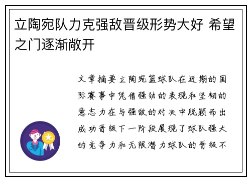 立陶宛篮球队在近期的国际赛事中,凭借强劲的表现和坚韧的意志力,在与强敌的对决中脱颖而出,成功晋级下一阶段,展现了球队强大的竞争力和无限潜力。球队的晋级不仅意味着他们在即将到来的比赛中拥有了更多的机会,也为立陶宛篮球的未来带来了更多的希望。在接下来的篇章中,我们将从四个方面详细探讨立陶宛队力克强敌的背景、表现、战术和展望,逐步揭示这一令人振奋的胜利背后所蕴藏的深远意义。首先,我们会分析立陶宛队如何在激烈的竞争中脱颖而出,接着讨论球队在技术层面上的突破和战术优势,随后探讨球员的精神面貌与团队合作,最后展望立陶宛篮球的未来,尤其是这一晋级是否能成为球队长远发展的契机。